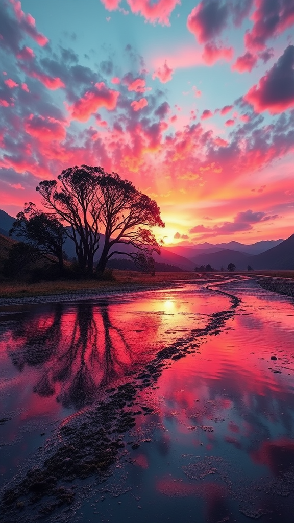 Envision a cosmic bubble multiverse where the rolling hills of New Zealand meet fantastical tree storms; parallel waters mirror the vibrant sunset, contrasting with the sky in waves of orange and pink neon hues, casting a surreal glow across the landscape.
