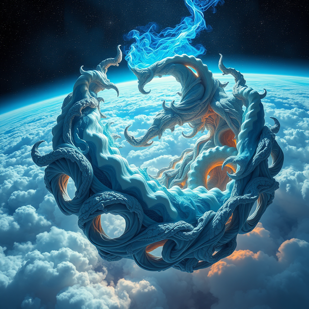 Envision a dreamscape high above the earth, embodying a celestial world nestled among the clouds, artfully inspired by the essence of Tanya Shatseva and the Stars Art Group. The scene is imbued with a harmonious blend of dark indigo and light cyan, where mind-bending sculptures twist and flow with an effortless fluidity, embodying both hyper-realistic detail and serene simplicity. The interplay of colors and forms creates a mesmerizing visual narrative, capturing the ethereal beauty of this sky-bound realm.