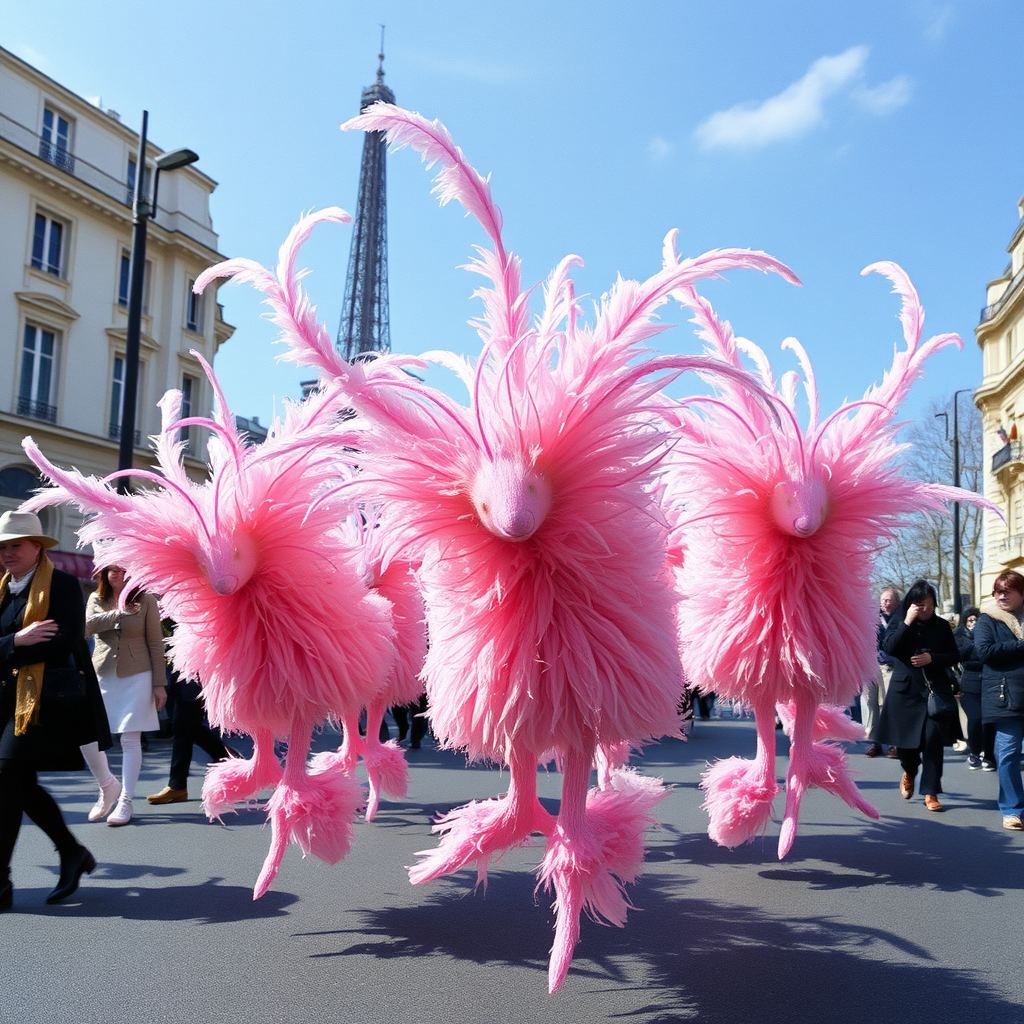 Envision a fantastical parade through Paris during the 1999 women's week, where whimsical creatures come to life, draped in ethereal hues of pink and indigo. Inspired by the imaginative brushstrokes of Kees van Dongen, the innovative flair of Sebastian Errazuriz, and the ethereal elegance of Fuyuko Matsui, these dreamlike beings are woven from delicate feathers. As they glide through pastel dreams, each creature tells a story of surreal beauty and otherworldly charm, transforming the streets into a vibrant canvas of enchanting elegance.
