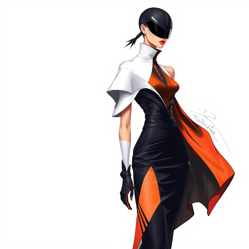 Envision a fashion illustration that encapsulates a fusion of futuristic elegance and avant-garde aesthetics, focusing on the creation of a haute couture ensemble characterized by sleek, aerodynamic lines and groundbreaking materials. This ensemble should incorporate unconventional elements that defy traditional fashion norms, inviting the exploration of striking color contrasts and fluid, dynamic silhouettes. Imagine a piece of wearable art that not only challenges convention but also embodies forward-thinking sophistication, serving as a bold statement of creativity and visionary design in the evolution of haute couture.