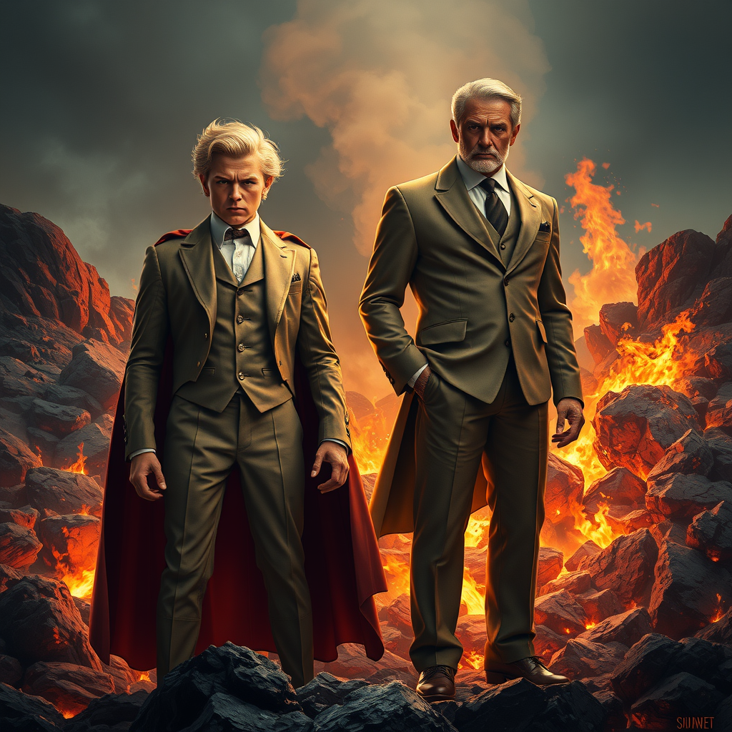 Envision a full-body portrait of a very blond-haired, affluent young man reminiscent of Richie Rich, transformed into a superhero, alongside a regal and composed butler inspired by Cadbury from the comics. Both characters rise from the ashes, standing firmly on rocky terrain with a steely determination that mirrors the simmering threat of an unseen villain. The atmosphere is intense with burning embers casting a warm glow, highlighting their stern expressions. Their intricate costumes, muted in color, contrast against the detailed rocky landscape. They gaze directly at the viewer, their presence captured in sharp, realistic focus. This emotionally profound scene, portrayed through the lens of high-resolution digital painting, features finely-tuned soft lighting and extreme detail that brings their transformation to life in an 8k masterpiece.