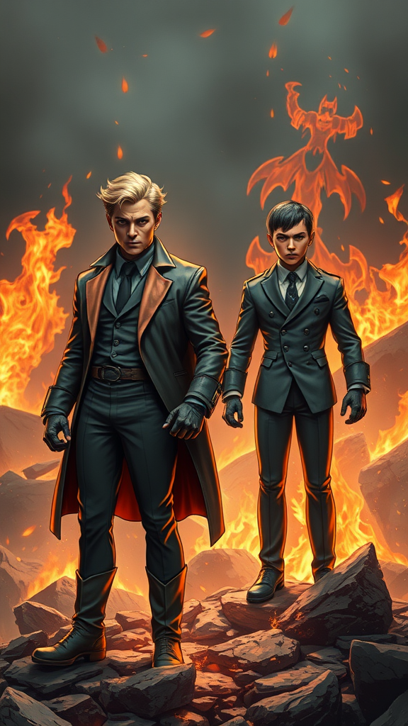 Envision a full-body portrait of a very blond-haired Richie Rich-like male character from the comics, now transformed into a superhero rising from the ashes. He stands on rocky ground with a determined and stern look, alongside a Cadbury-like butler character, both embodying strength and resilience. The villainous environment around them burns intensely, yet their focus remains sharp and unwavering. Their expressions are emotionally profound, captured with intricate details and muted colors that bring the scene to life with photographic realism. The soft lighting enhances the 8k extreme detail of this digital painting, adding depth and intensity to the image while maintaining the heroic essence of these comic-inspired figures.