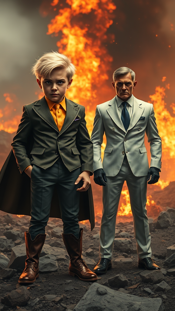 Envision a full-body portrait of a very blond-haired Richie Rich-like male from the comics, alongside a Cadbury-like butler character, transformed into superheroes emerging from the ashes. They stand on rocky ground with a stern look, embodying a sense of triumph over a vanquished villain. The scene is set with a burning backdrop, captured in sharp focus with intricate details and muted colors. The two figures, looking directly at the viewer, convey a sense of determination and resilience. The piece is a realistic, emotionally profound digital painting, capturing the subtle nuances in highly detailed, soft lighting. Photographic realism in 8K quality, with extreme attention to detail, brings this vision to life.