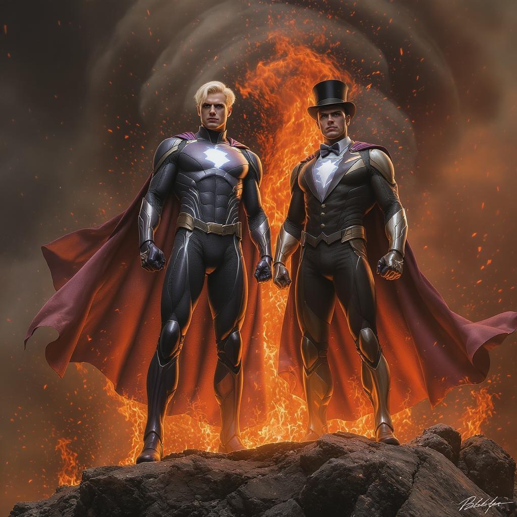 Envision a full body portrait of a very blond-haired Richie Rich-inspired male and a Cadbury-like butler reimagined as superheroes. They rise majestically from the ashes, standing on rugged rocky ground. The scene is dramatic with flames and smoke swirling around them. Both characters wear stern, determined expressions as they lock eyes with the viewer, embodying strength and resilience. The texture of their suits is intricate, showcasing high-tech armor with subtle, muted color palettes. The image captures a photography-like realism, with soft, atmospheric lighting highlighting their profiles. Despite the chaos, the focus remains razor-sharp, bringing to life every detail from their commanding postures to the intensity in their eyes. The setting is emotionally profound, embodying themes of rebirth and perseverance, rendered in 8k resolution with extreme detail capturing the essence of a digital painting masterpiece.