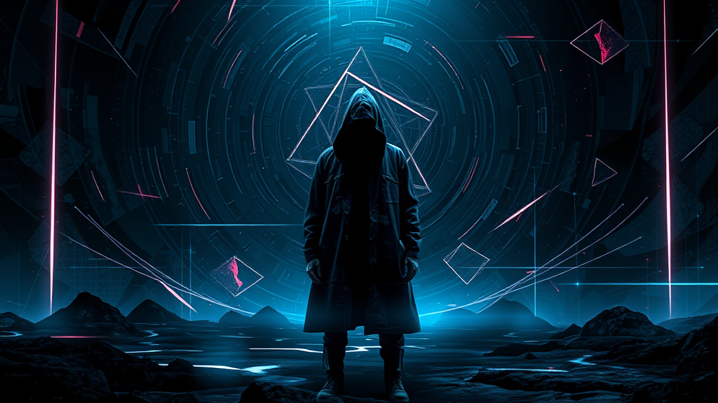 Envision a futuristic, shadowy landscape with intricate geometric patterns and neon accents, evoking a sense of mystery and depth. The background is a swirling mix of deep blacks and midnight blues, punctuated by sharp, angular shapes that shimmer with a metallic sheen. In the foreground, an enigmatic figure stands cloaked in layers of abstract digital textures, their form dissolving into the electronic ether. Subtle pulses of light ripple through the scene, casting dynamic shadows and adding a hypnotic rhythm, drawing the viewer into a world of immersive soundscapes and hidden realms.