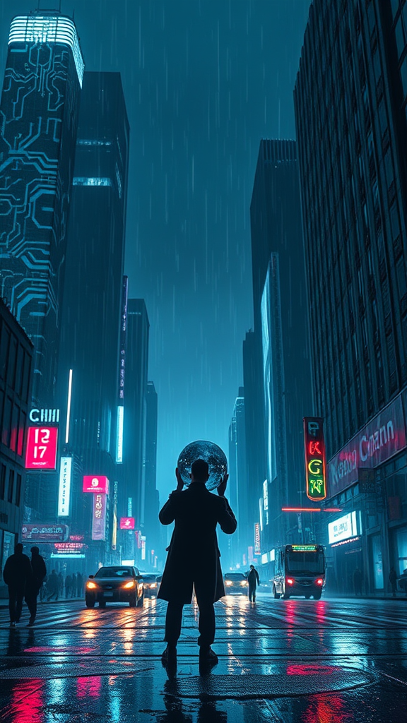 Envision a futuristic, shadowy metropolis under an electric storm, with neon lights reflecting off rain-soaked streets. Towering skyscrapers with abstract patterns loom in the background, their sleek surfaces glowing with pulsating circuits. A mysterious figure in a trench coat stands silhouetted against this electric ambiance, holding a reflective orb that mirrors the city's chaos and beauty. The mood evokes a hypnotic allure, drawing the observer into a cosmic dance between technology and darkness. The album title, subtly embossed, hovers above in an ethereal typeface, merging seamlessly with the atmospheric scene.