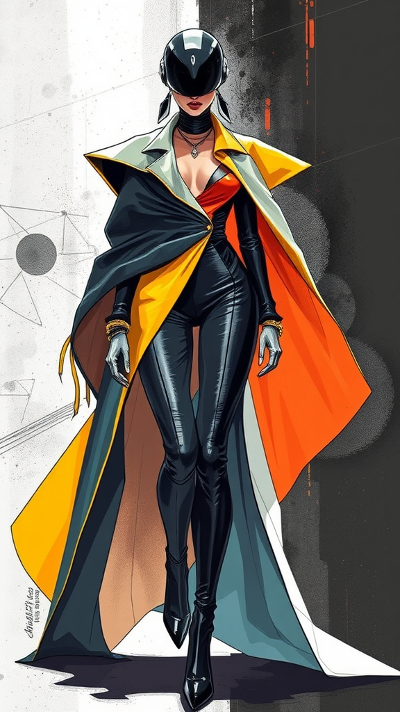 Envision a groundbreaking fashion illustration that merges futuristic elegance with avant-garde artistry. The artist is guided to design a haute couture ensemble showcasing sleek, aerodynamic lines, crafted from innovative, boundary-pushing materials. Unexpected elements are woven into the design, challenging traditional fashion norms and inviting curiosity. Bold color contrasts are explored, combined with dynamic, fluid silhouettes, to create a wearable masterpiece that transcends conventional style limitations. This illustration seeks to evoke forward-thinking sophistication, presenting a fashion statement that embodies creativity and bold vision, blazing a trail for the future of haute couture.