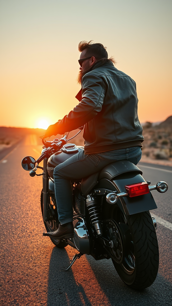 Envision a hyper-detailed depiction of a rugged biker astride a classic Harley Davidson, cruising down the iconic Route 66 at sunset. From a side angle, capture the warm glow of the setting sun reflecting off the polished chrome and the weathered leather of the biker's jacket. The open road stretches ahead, with hints of desert landscape and distant mountain silhouettes. The scene encapsulates the spirit of freedom and adventure, framed in a 4:6 aspect ratio.