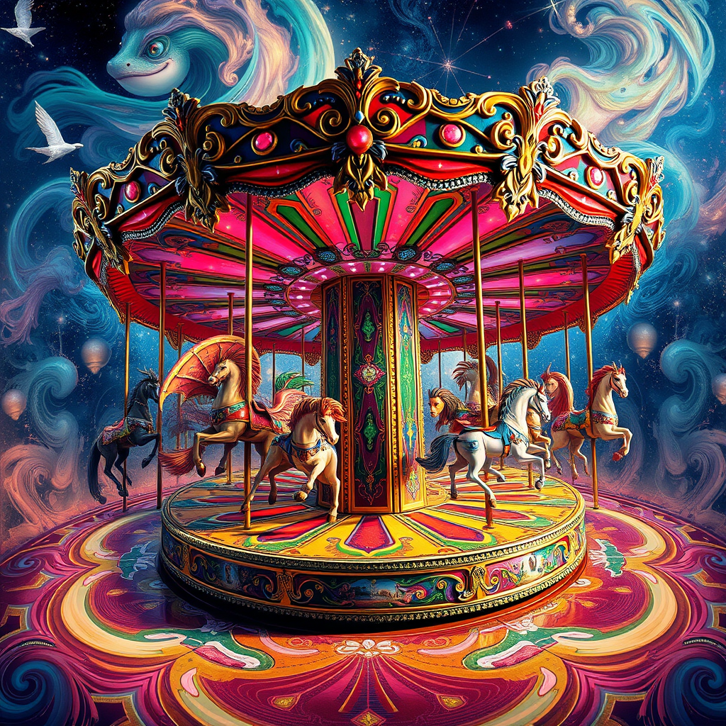 Envision a kaleidoscope of carousels spinning in a harmonious multiverse, each platform adorned with fantastical creatures from parallel worlds, their vibrant colors and swirling patterns reflecting the endless possibilities of alternate realities.