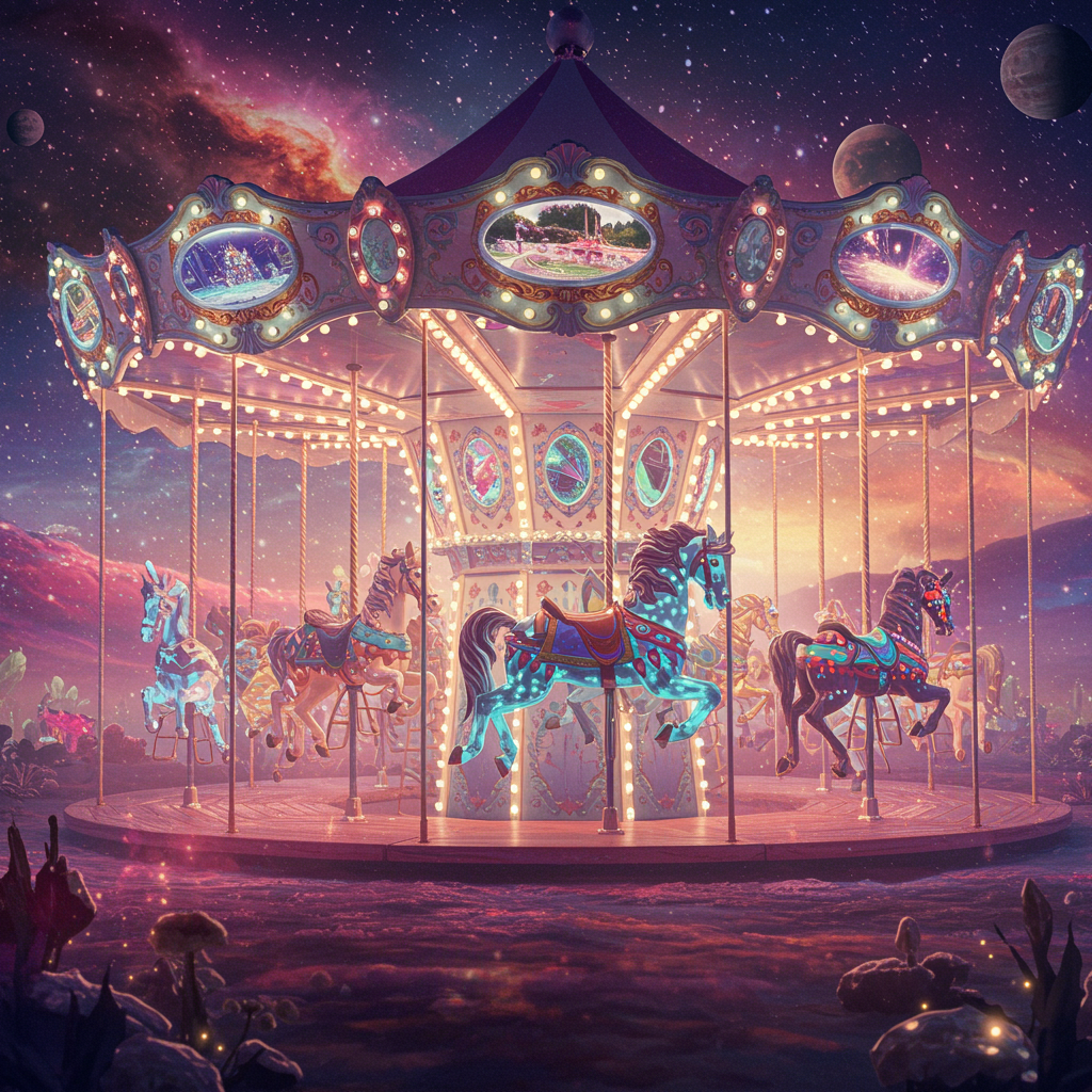 Envision a kaleidoscopic universe where each carousel horse is a portal to a different realm, spinning in an endless dance of vibrant possibilities.