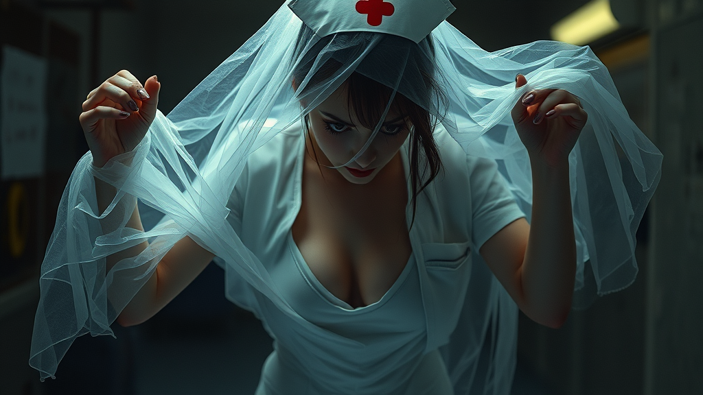 Envision a legendary photoart masterpiece with dark and terrifying themes, featuring an ominous nurse reminiscent of Silent Hill. Her short uniform boasts a deep neckline, while gauze wraps around her form, capturing her in a frozen, contorted pose. The scene embodies dark fantasy and beautiful horrorcore, with an expressive and epic cinematic quality. Conceptualized by Artificial Nightmares, it delivers a high-definition, 32k resolution that mesmerizes with its vivid detail. This expressive scene unfolds in a vertical aspect ratio that amplifies its dramatic intensity, echoing an anime-like surrealism.