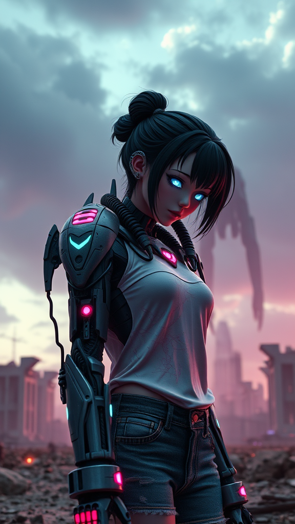Envision a mechanical girl inspired by Kidou Keisatsu Patlabor, clad in intricate bioluminescent cyborg armor, her detailed face illuminated by global lighting in cold tones. The armor, richly detailed with Egyptian motifs, casts realistic shadows under ultra-sharp 8k Octane render settings. Her glowing eyes and mechanical limbs, intertwined with blood vessels and tubes, signal a duality of allure and lethality. Positioned against a desolate, post-apocalyptic backdrop, she stands amidst towering ruins, under a sky darkened by ominous clouds. A towering creature lurks in the distant background, adding a sense of foreboding. In homage to Neon Genesis Evangelion, the scene is rendered in dramatic pink and violet hues, as she looks down with a cold, calculating gaze. Her ensemble, a modern twist of black hair in a bun and casual denim with a white T-shirt, contrasts her mechanical menace. The overall emotion is one of complex attraction and danger, a masterpiece of cinematic light and meticulous detail, balancing the sophisticated allure of machinery with the nuanced expression of human emotion.