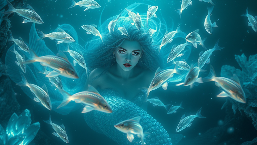 Envision a mesmerizing masterpiece featuring a cursed mermaid named Shelma, enveloped by a swirling array of luminous, ethereal fighting fish that radiate a soft, otherworldly glow. Set against a backdrop of dark azure waters and shimmering white crystal formations, the scene captures the essence of solarpunk within an expansive galaxy dimension. Shelma's eyes reflect hope as they gleam with the radiant luminosity of the water, casting a subtle iridescence onto her scales. Crafted with hyper-realistic detail using cutting-edge daz3d techniques, the image is presented in stunning 32k UHD resolution, capturing every nuance and facet of this captivating underwater world in extraordinary clarity.
