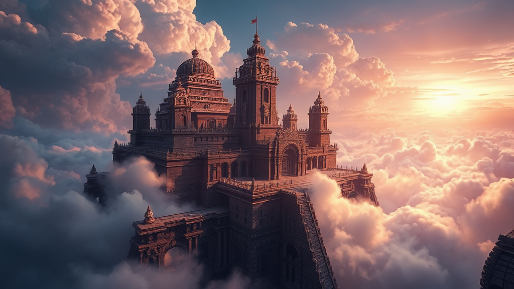 Envision a Phase-Space Astral Inca city suspended amidst ethereal clouds, a photorealistic and intricately detailed matte painting where deep, rich colors blend seamlessly with the fantasy landscape. The architecture reflects a harmonious blend of ancient Inca influences and otherworldly elements. Layered, textured surfaces and delicate carvings are illuminated by a mystical light, casting enchanting shadows. Complementary colors dance throughout this mesmerizing scene, embodying a gothic masterpiece akin to a DeviantArt classic. The setting is devoid of human presence, evoking a timeless, serene atmosphere in 8k resolution.