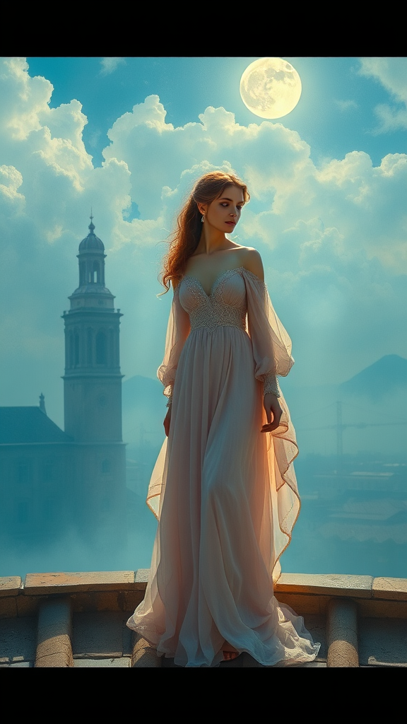 Envision a scene titled "Lady on the Roof, 1884," inspired by Louis Carroll, showcasing a woman amidst an ethereal setting, exuding classical elegance. The artwork features a palette of light aquamarine and soft amber, reminiscent of Phoenician artistry, with an emphasis on realistic fantasy elements. The style echoes the light-filled vibrancy of Die Brücke, capturing a moment of tranquil passage. The scene is rich in detail and painting-like textures, illuminating a serene yet imaginative atmosphere.