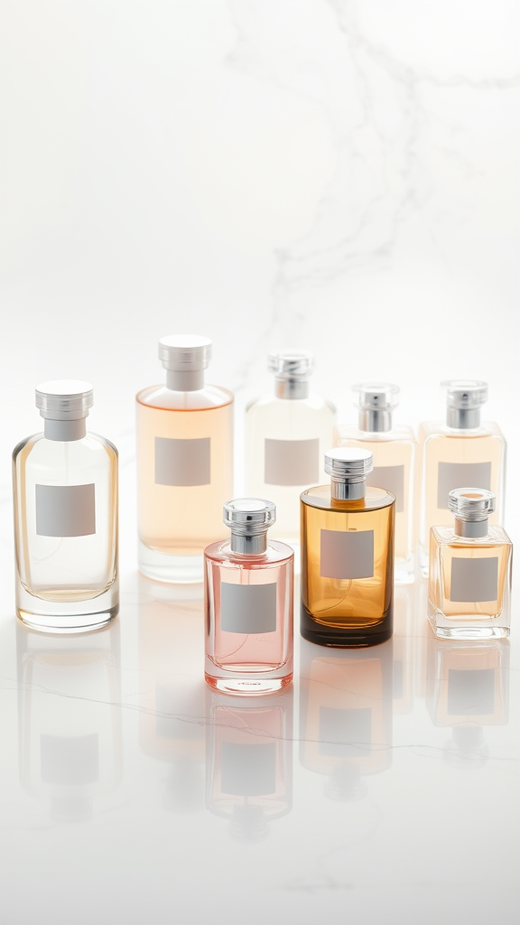 Envision a serene yet luxurious display of perfume bottles gracefully arranged on a polished, white marble surface. The bottles vary in form and dimension, yet all exude elegance and refinement. Each vessel is crafted with sleek lines and minimalist accents, such as a gentle silver cap or a delicate embossed pattern. The bottles are devoid of labels, allowing the fragrance colors to be subtly suggested through the hues of the liquid they contain. The background features a soft gradient of white and silver, with subtle highlights that play with the light and enhance the scene’s opulence. The overall ambiance is one of quiet sophistication and polished allure, enticing the viewer to imagine the captivating scents and the opulent experience of wearing them.
