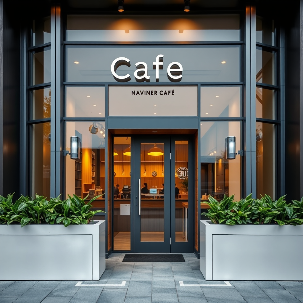 "Envision a sleek and contemporary cafe facade featuring clean lines and a glass-fronted exterior, accented with warm wooden slats and subtle metal details for contrast. The entrance is framed by minimalist planters with lush greenery, enhancing the natural vibe. A minimalist sign with the cafe's name in stylish, sans-serif typography sits above the doorway, while ambient lighting fixtures softly illuminate the facade, adding an inviting, cozy glow at dusk."