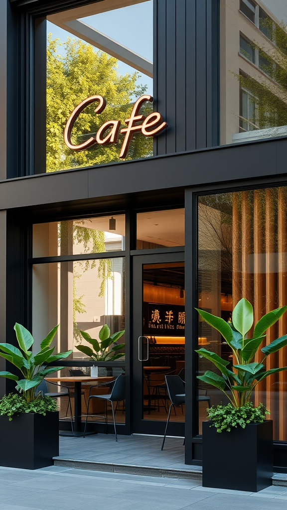 Envision a sleek and inviting cafe facade featuring large, floor-to-ceiling windows that allow ample natural light to wash over the interior. The exterior is clad in matte black panels contrasted by warm wooden accents, creating a harmonious balance of textures. A minimalist, elegant sign with the cafe's name in simple, sans-serif font is subtly illuminated by soft, integrated LED lighting. Planters with lush green foliage flank the entrance, adding a touch of nature and freshness. A few strategically placed outdoor seating options with minimalistic chairs and tables invite passersby to linger and enjoy the atmosphere.