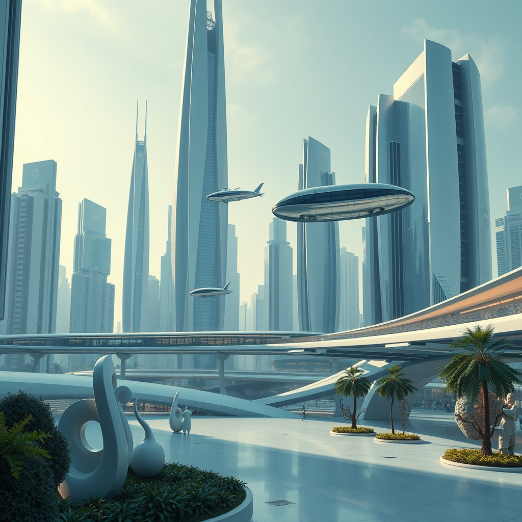 Envision a sleek futuristic cityscape bathed in a cool, serene light, where towering skyscrapers with smooth, geometric forms reach towards a tranquil sky. The buildings are interconnected by streamlined skybridges and adorned with subtle neon accents in shades of blue and silver. A state-of-the-art transportation system with levitating pods glides silently through the air, reflecting the city's chrome surfaces. In the foreground, a minimalist plaza is dotted with abstract sculptures and lush greenery, offering a contrast to the urban environment. The scene conveys a sense of harmony between advanced technology and serene living.