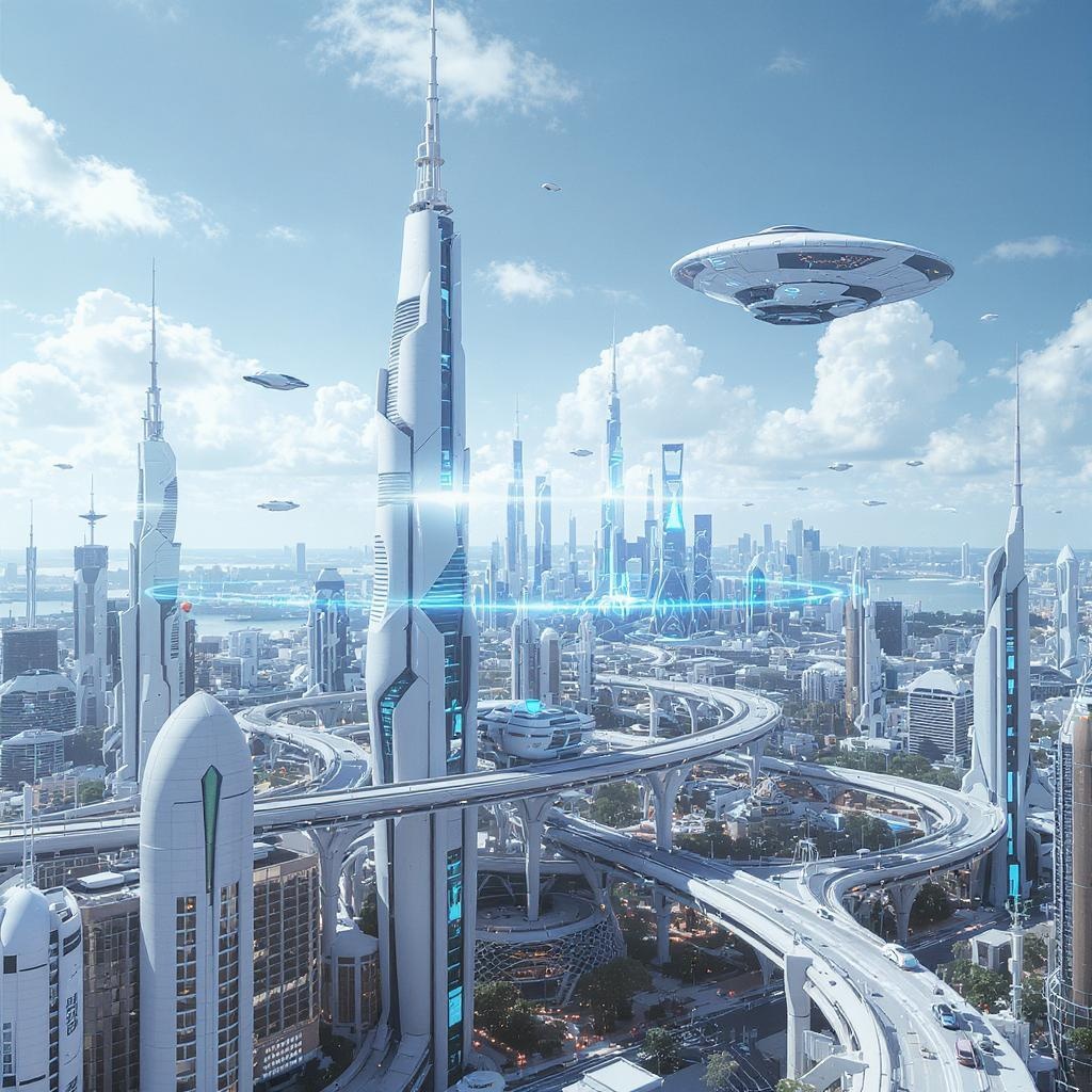 Envision a sleek futuristic cityscape with towering skyscrapers and elevated transit systems, crafted using clean lines and geometric shapes. The limited color palette features shades of silver, blue, and white, evoking a sense of modernity and sophistication. Hovering vehicles glide seamlessly through the air, while digital screens subtly integrate into the architecture, providing information and light. The skyline merges seamlessly into the horizon, where a distant spaceship docks majestically above in the sky, its design echoing the city’s minimalist aesthetic.