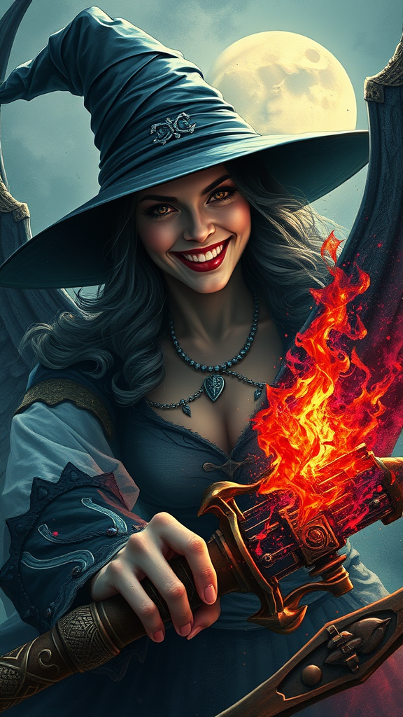Envision a smiling witch at the heart of a breathtaking action scene of vengeance, inspired by the essence of Eledrae by Taijen 3, in a style reminiscent of Alberto Vargas. The composition unfolds as a polished metamorphosis, merging trompe l'œil illusionistic detail with vibrant elements of stripcore. As if in a dream, the scene is enveloped in otherworldly, mystical realism, carrying a unique and ultra-detailed aura. Though abstract, it remains representational, seamlessly crafted in Adobe Photoshop. This is an inspired, artistic masterpiece that stands as an award-winning creation, full of creative energy and elegance.