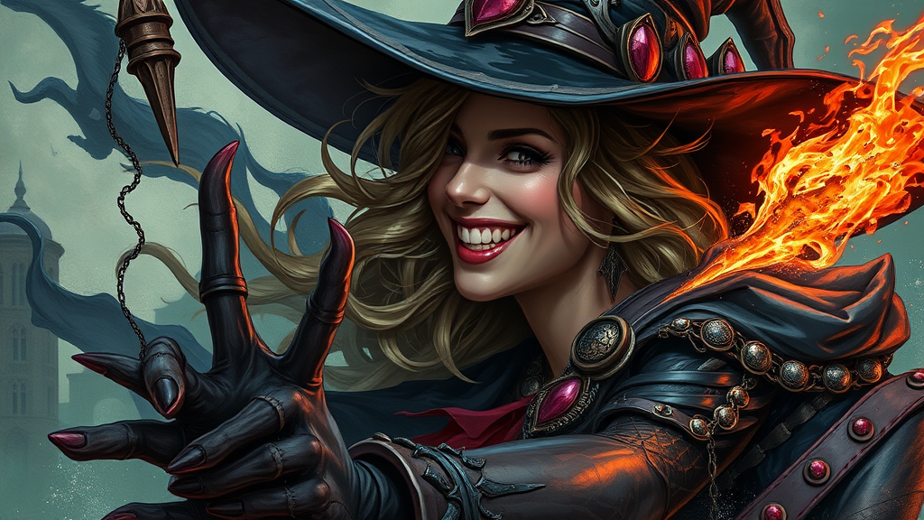 Envision a smiling witch immersed in a breathtaking action scene of vengeance, as if drawn from Eledrae by Taijen 3, styled in the elegance of Alberto Vargas. Her form undergoes a polished metamorphosis, merging trompe l'œil illusionistic details with elements of mystical realism. Set against a backdrop of stripcore dreamscapes, this otherworldly depiction boasts unique artistry, teeming with ultra-detailed, abstract yet representational visuals. Crafted with Adobe Photoshop, the scene is infused with inspired, award-winning creativity that captivates the imagination.