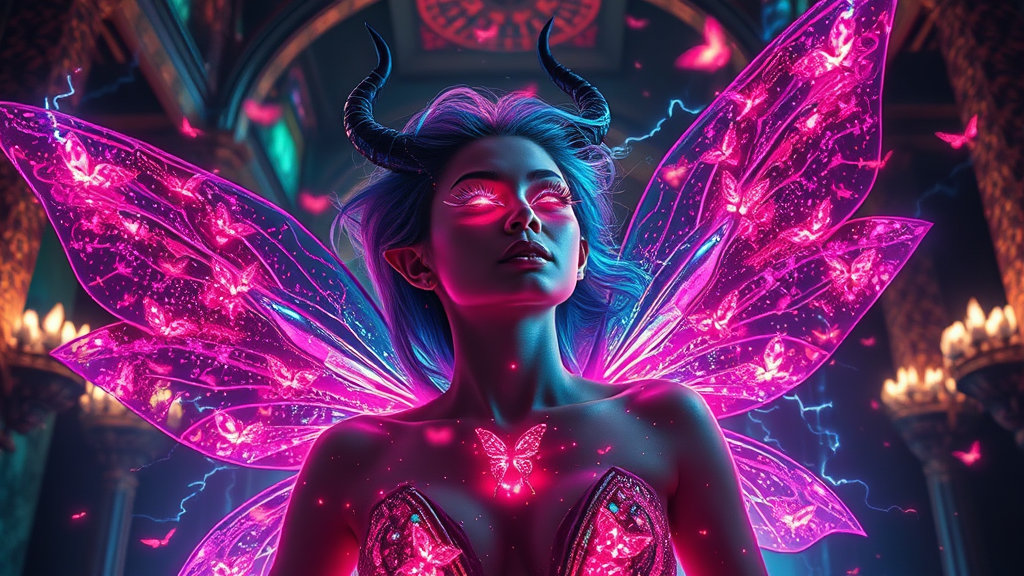 Envision a stunning masterpiece in a sanctuary temple setting, where a devil fairy with dark magic channels the essence of a devil soul. Jinn and demon energies intertwine with a divine presence, enhancing the clean skin and vibrant aura of the fairy. Her translucent glass wings shimmer with particles of multi-colored lightning. Neon hair, alive with swirling energy, frames her face, accentuating her glowing eyes and full makeup. The scene is enveloped in dark fantasy, as she levitates gracefully, head lifted towards the sky, surrounded by a dazzling swarm of lighting butterflies. Captured in 32k UHD resolution, the vivid, vibrant colors and cinematic lights create a brilliant, high-resolution composition. The professional, realistic photography captures the hyper-emotional moment with perfect anatomy and stunning depth of field, embodying the essence of artistic brilliance.