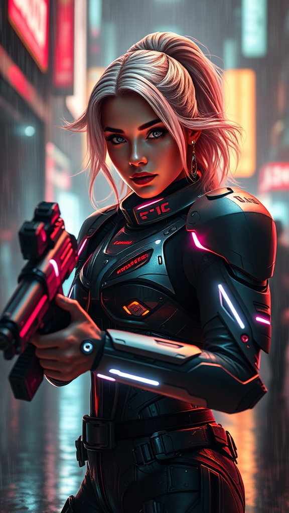Envision a stunning young woman radiating beauty and confidence, embodying a goddess-like presence. She's adorned in sleek sci-fi medium armor accentuated with neon lights that cast a mesmerizing glow. Her eyes, an ethereal white, shine with intensity as she stands poised in an urban environment, rain gently cascading around her in slow motion. The scene is alive with neon reflections, enveloped in a mysterious fog that adds depth to the atmosphere. Her dynamic posture highlights her readiness for action, wielding a futuristic laser gun with precision. A latex sheen flows over her perfectly symmetrical face, accentuated by a confident smile that exudes a cyberpunk essence. Her futuristic hairstyle flows with movement, bringing forth a sense of nostalgia and familiarity akin to a Star Wars character, clad in an intricate, futuristic military uniform. The artwork is rich with intricate details and dramatic lighting, capturing the essence of HDR and photorealism. Lens flares dance across the scene, echoing popular art platforms like ArtStation and CGSociety. Vivid, stylized designs inspired by well-known artists like Artgerm, Greg Rutkowski, and Viktoria Gavrilenko breathe life into this vision. Surrounded by an army of identical clones, each reflecting her unique charm and design, the scene explores multiplicity amidst a backdrop of weird, yet captivating colors. The image seamlessly integrates elements of video game graphics, encapsulating a blend of realism with artistic interpretation. This stunning creation stands as a testament to the fusion of beauty, strength, and futuristic elegance.