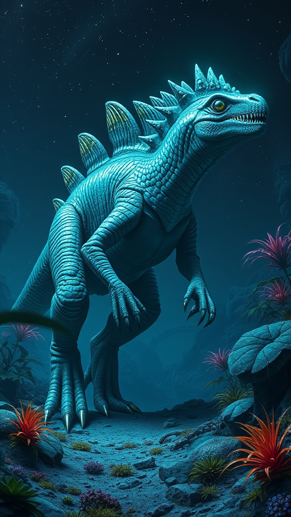 Envision a towering extraterrestrial creature resembling a dinosaur, with shimmering iridescent scales that catch the ambient starlight. Its elongated limbs are both powerful and graceful, ending in talons that leave intricate impressions on the alien terrain. Above, a crest of bioluminescent spines pulses gently, casting an eerie glow. Its eyes, large and intelligent, reflect a universe of stars, as it navigates the strange, lush landscape with both curiosity and authority. The surrounding environment is filled with exotic plant life, with colors and forms unknown to Earth, creating an otherworldly habitat for this magnificent being.