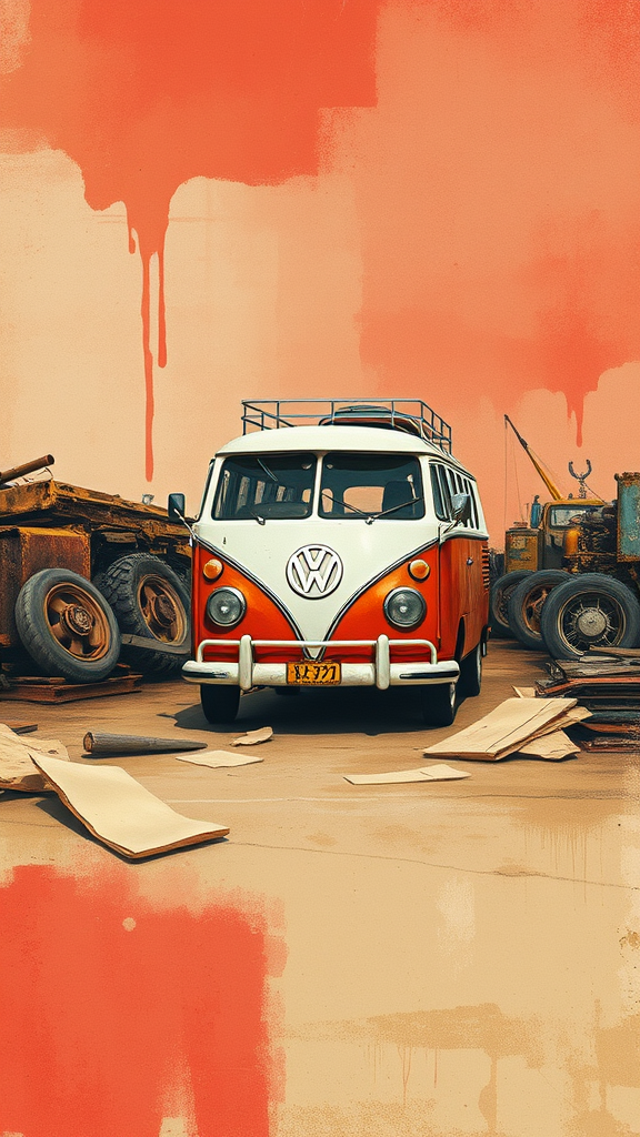 Envision a vintage VW bus at the heart of an abstract canvas art piece, incorporating the ethereal touch of Brian Mashburn's style. The hues of light red and light brown intertwine seamlessly, paired with charming character illustrations reminiscent of Theo Prins. The scene evokes a sense of nostalgia with Pierre Pellegrini's influence, using vintage cut-and-paste techniques amidst a backdrop of rusty debris. The artwork maintains an elongated perspective, showcasing a dreamy, surreal quality.