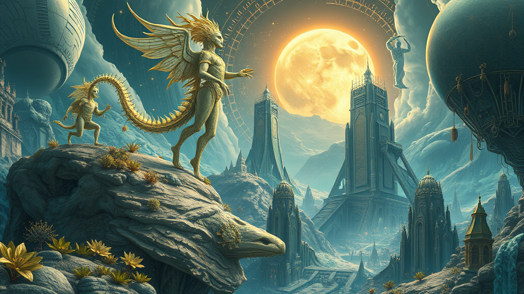 Envision a visual fiction crafted by a renowned illustrator inspired by Christiano V, embracing the surreal style of Franciszek Starowieyski. It features hyper-realistic, sci-fi romantic illustrations with a captivating interplay of gold and cyan hues. The artwork showcases organic sculpting, drawing inspiration from Android Jones, and weaves elements of romantic fantasy. Imagine a world where ethereal creatures and intricate landscapes blend seamlessly with futuristic technology, creating a dreamlike narrative that transcends time and space.
