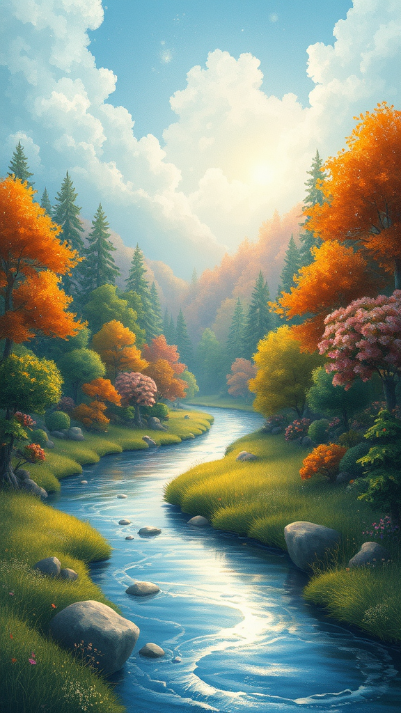 Envision a whimsical illustration showcasing a serene and tranquil landscape. In the backdrop, vibrant and lush woodlands create a tapestry of rich colors. In the foreground, a gentle river weaves its way through the scene, its surface shimmering like liquid silver under the sun's soft caress. The entire setting exudes a fairy tale magic, evoking a sense of wonder and calm, where time seems to slow down and every element whispers a soothing story of nature’s harmony.