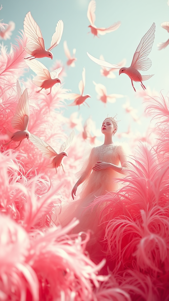 Envision a whimsical world inspired by Paris Women's Week 1999, where pastel dreamscapes come alive with imaginative creatures. Drawing influences from Kees van Dongen, Sebastian Errazuriz, and Fuyuko Matsui, the scene bursts with ethereal elegance. Delicate beings, crafted from feathers, glide gracefully through an ethereal tapestry of pink and indigo hues. Each creature, a blend of fantasy and fashion, exudes an otherworldly charm, dancing along the edge of reality with a playful yet sophisticated allure.