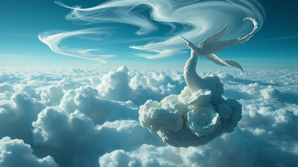 Envision an ethereal world adrift in the clouds, imbued with the artistic essence of Tanya Shatseva and the Stars Art Group, echoing the dreamlike touch of Meghan Howland. The scene is bathed in a palette of deep indigo and soft cyan, highlighting mind-bending sculptures that defy logic. These sculptures possess a paradoxical blend of realistic hyper-detail and fluid simplicity, capturing the imagination. The sky stretches infinitely, with cloud formations swirling like celestial brushstrokes, creating a breathtaking tapestry. Every element whispers a story through elegant, surreal twists, inviting viewers into this mesmerizing realm.