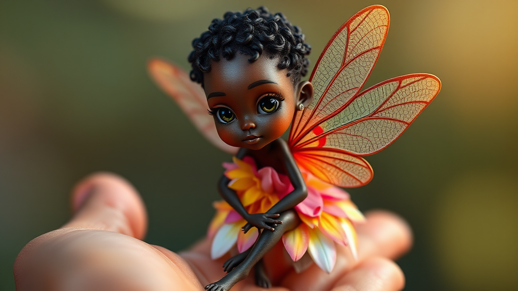 Envision an ultra-high definition, intricately detailed full body portrait of a miniature, anthropomorphic fairy girl, a small magical creature brimming with enchanting elegance and grace. She represents a captivating blend of the familiar and the fantastical. This petite fairy, a representation of African beauty, has rich, dark skin that radiates with a warm, iridescent glow, accentuating the contours of her delicate features. Her eyes sparkle with lively curiosity and youthful energy, and her short, black hair coils playfully, defying gravity. She wears a dress crafted from the petals of the most vibrant and colorful flowers, the unique garment clinging delicately to her petite form, enhancing her lively personality. Her most striking feature, her shimmering wings, unfurl from her back, catching the light with every flutter. They resemble those of a dragonfly, a mosaic of luminescent colors, delicate yet powerful, hinting at her ability to transcend the human world and enter the realm of enchantment. She perches confidently in a human hand, the realistic rendering of the hand contrasting with her fantastical existence, showcasing a myriad of textures from the fine lines of the skin to the smoothness of the nails. The size comparison further emphasizes the fairy’s petite charm. Despite the size difference, the interaction is harmonious, suggesting a magical connection between the human and fairy realms. Her gaze meets the viewer’s, carrying an unspoken conversation, a secret shared between magical and human worlds. The viewer is left with an impression of an encounter that blurs the line between reality and fantasy, a moment frozen in time where anything is possible.