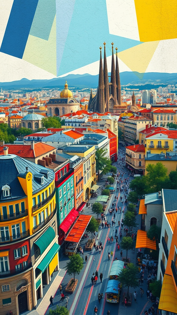 Envision Barcelona through the eyes of Pablo Picasso, where the city transforms into a vivid tapestry of Cubist expression. Fragmented shapes and bold geometric forms depict the iconic skyline, weaving together the intricate spires of Sagrada Familia, the whimsical, mosaic-covered structures of Park Güell, and the vibrant, bustling energy of La Rambla. The scene is captured from a high vantage point using a wide-angle perspective, emphasizing the kaleidoscope of diverse architecture and lively streets below. A rich, vibrant color palette dominates, with blues, reds, yellows, and greens intermingling in a dance of hues reflective of Picasso's signature boldness. The composition achieves a dynamic balance, seamlessly merging the ceaseless energy of Barcelona with the abstract, visionary nature of Cubism, infusing the cityscape with a sense of creative fluidity and innovation.