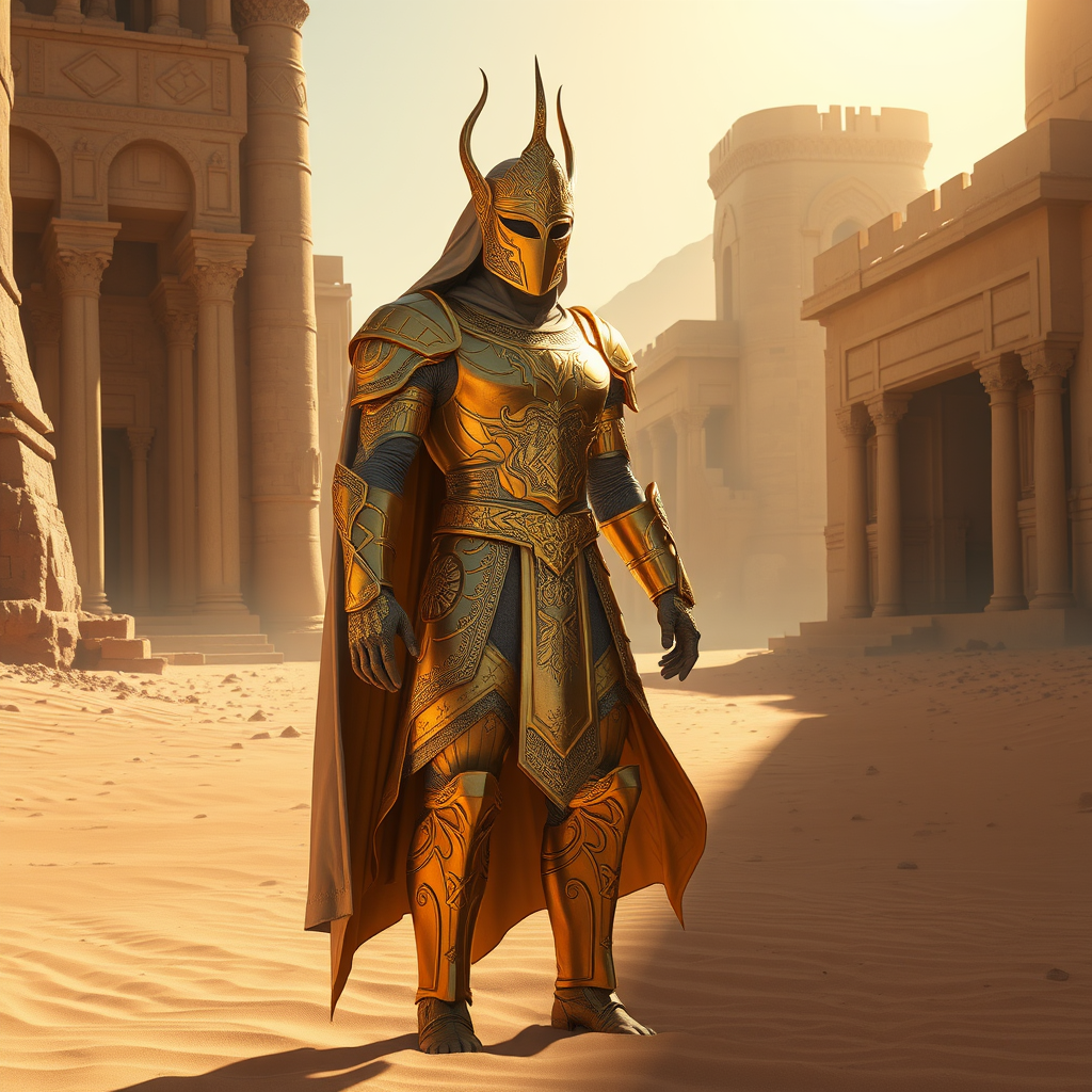 Envision the regal and majestic form of Original Azir captured in a hyper-realistic photograph, set within an ancient desert cityscape. The scene showcases Azir's intricately designed golden armor, glinting under the desert sun, while delicate sand patterns swirl around his feet. Advanced lighting techniques highlight the ornate details of his armor, casting intricate shadows on the ground. The towering sandstone structures surrounding him are rendered with lifelike precision, their weathered facades hinting at the passage of time. Every element of the image, from Azir's commanding posture to the sun-drenched cityscape, is crafted with immersive realism, creating an awe-inspiring visual experience that embodies Azir's power and grandeur. Small creative modifications, such as a subtle play of light and shadow, enhance the awe factor while staying true to the core essence of the scene.