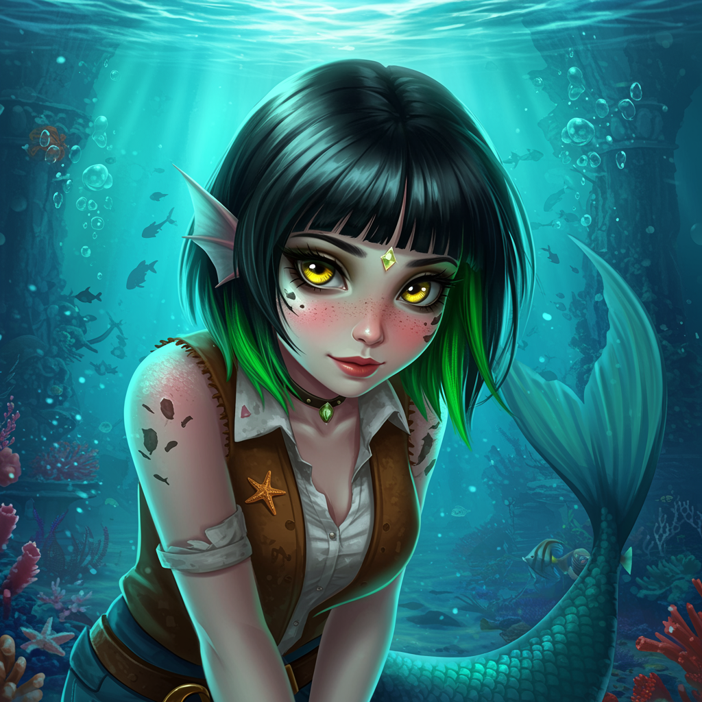 Envision a scene featuring a young woman, her presence captivating amidst an enchanting underwater fantasy setting. Her hair, a striking two-tone blend of black and green, falls in straight, shoulder-length strands, delicately tucked behind one ear. With blunt bangs framing her face, her radiant yellow eyes, accentuated with black eye shadow and liner, convey a sense of mystery and allure. The subtle blush highlights her cheeks, adding to her natural beauty. Her lips are of a soft, natural hue, perfectly complementing her expressive eyes. Adorning her forehead is a piece of exquisite jewelry that sparkles like a rare gem amid the sea, hinting at her mermaid lineage, further evidenced by the subtle mermaid scales gracing her skin. Her expression is both shy and inviting, a gentle smile touching her lips as she executes a playful head tilt. She stands on the sea floor, facing the viewer, surrounded by vibrant underwater life. Her cowboy-inspired attire adds a unique twist, complete with a confident posture that balances the whimsical with the distinctive. The entire scene is rendered with high resolution and cinematic detail, every element painstakingly detailed to bring this dreamlike fantasy to life. The overall atmosphere exudes beauty and charm, inviting viewers into a world both serene and fantastical.