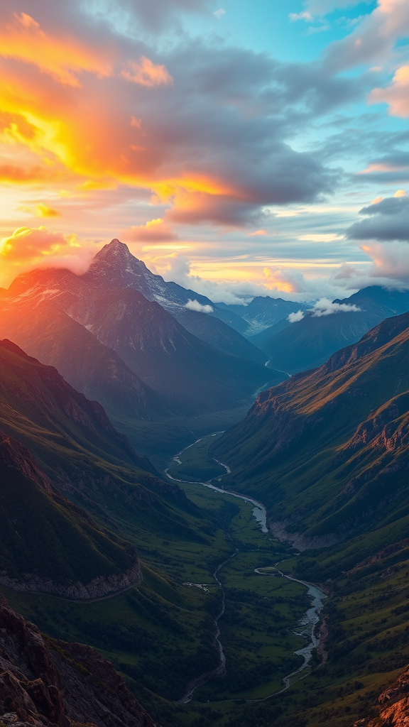 Epic 4K ultrarealistic scene of a majestic mountain range with a vibrant sunset casting golden hues across the peaks, lush green valleys stretching below adorned with shimmering rivers, and a sky filled with dramatic, swirling clouds painting a breathtaking panorama.