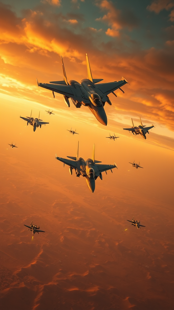 Epic aerial action scene inspired by Top Gun, featuring an F-14 fighter jet and its squadron engaging in an intense dogfight with enemy jets above a vast desert landscape in the Middle East. The scene captures the high-altitude chaos as jets weave through the sky, firing air-to-air missiles in a hyper-realistic portrayal of aerial combat. Shot using a Sony A7R IV paired with a G Master FE 16-35mm f/2.8 lens, offering ultra-detailed clarity, with a bird's-eye perspective provided by a DJI Phantom 4 Pro drone camera. The golden hour lighting paints the sky in dramatic hues of orange and gold, enhancing the tension and beauty of the scene, as envisioned by director Ridley Scott.