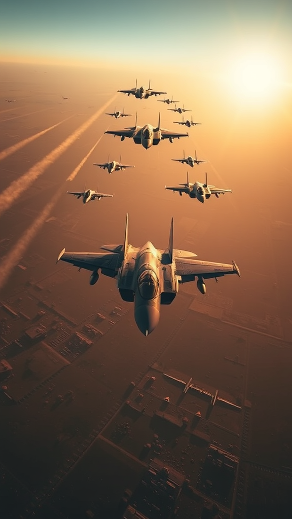 Epic aerial action scene, reminiscent of a modern Top Gun sequence, showcasing an F14 fighter plane leading a squadron of fighter jets in an intense aerial battle against enemy fighter jets above a vast, arid Middle Eastern landscape. The planes soar through the golden hour sky, casting long shadows on the terrain below. Air-to-air missiles streak through the atmosphere, leaving behind trails of smoke as they target enemy aircraft. The scene is captured from a bird’s-eye view by a DJI Phantom 4 Pro drone camera, providing a sweeping perspective. The ultra-realistic visuals are captured with a Sony A7R IV paired with a G Master FE 16-35mm f/2.8 lens, ensuring hyper-detailed imagery. The cinematic feel is enhanced under the masterful direction of Ridley Scott, creating an intense, action-packed moment in the sky.