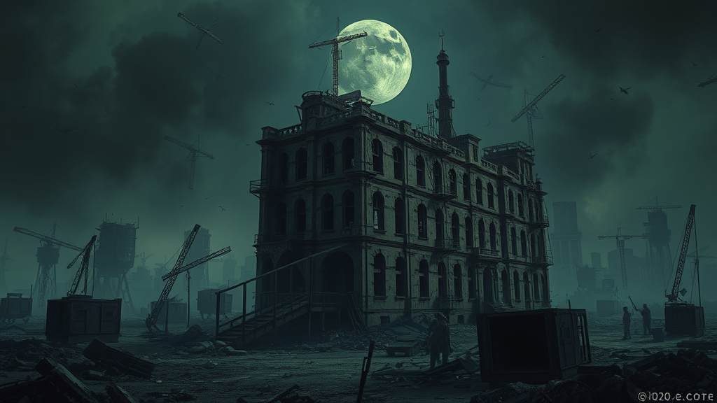 Epic and realistic end of the world scene set at night with an apocalyptic atmosphere. Abandoned structures cast in neutral colors populate the complex background, creating a cinematic shot with artistic screen space refractions and a subtle vignette. The focus is on a decaying, intricate building. The scene avoids negative elements like poor drawing, anatomical errors, and unintentional disfigurement, instead capturing a haunting yet captivating view of a deserted, dystopian landscape.