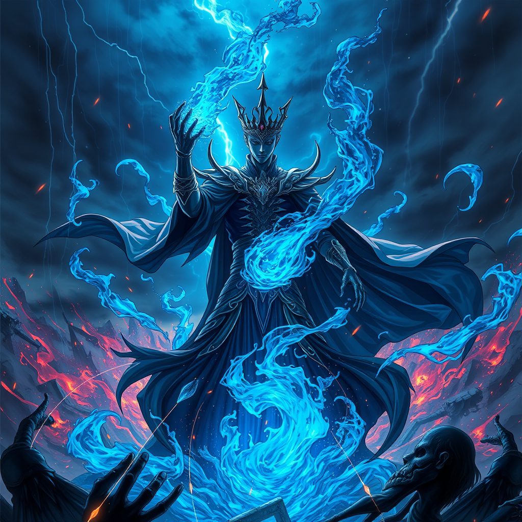 Epic anime scene in stunning 8K resolution featuring a sorcerer humanoid male prince of darkness dominating the battlefield, surrounded by swirling blue infernal flames and sparks in the backdrop. The apocalyptic ambiance is vividly colorful, highlighting intricate and elegant details. This digital illustration captures a scenic, hyper-detailed masterpiece under a dramatic thunderstorm, enhancing the majestic and formidable presence of the sorcerer prince as he rises amidst chaos.