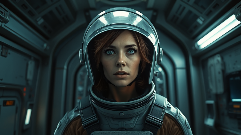 Epic cinematic 8k scene featuring Ellen Ripley with a determined expression, inspired by the Alien movie. She stands, clad in a highly detailed astronaut suit and helmet, in a dimly lit corner of the Nostromo space shuttle. The scene captures her symmetrical and striking facial features. The interior reflects a gritty sci-fi ambiance, enhanced by photorealistic details and masterful ray tracing. Ultra-realistic textures and overcast reflections bring life to the promotional artwork, which showcases movie-quality visuals. The shot, akin to being captured on a Canon 5D, boasts redshift render capabilities and advanced vfx post-production, achieving cinematic excellence in RTX ray tracing lighting, perfect for an 8K display.
