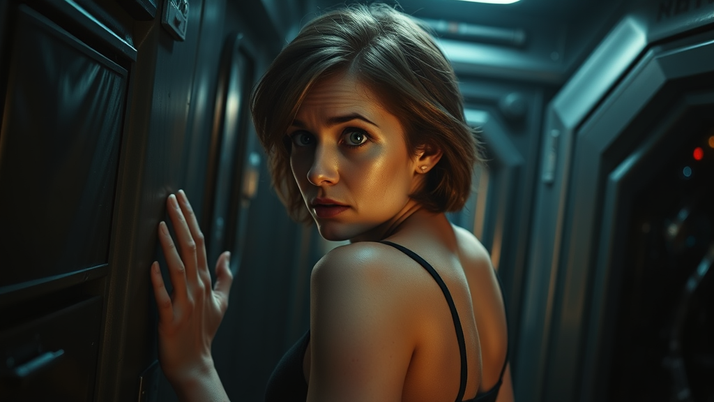 Epic cinematic 8k wallpaper capturing Ellen Ripley with a resolute yet frightened expression from the Alien movie, dressed in a wife beater, wide angle action pose showing half of her body, her forehead and cheeks glistening with sweat, centered in a close-up composition, back pressed against the metallic wall of the dimly lit Nostromo shuttle. The setting is dark and immersive, incorporating sci-fi elements with ray tracing. A subtle rim light highlights her form, achieving ultra-detail and top-tier cinematic quality. The atmosphere is stoic yet dramatic, employing dark moody tones, with lumen reflections and ambient lighting that bring a 4K feel to the image. Vogue-like elegance is achieved with Rembrandt lighting, enhanced by high contrast and shallow focus. RTX ray tracing lighting offers an ultra-realistic presentation, rendered with octane for ultimate clarity in 8K.