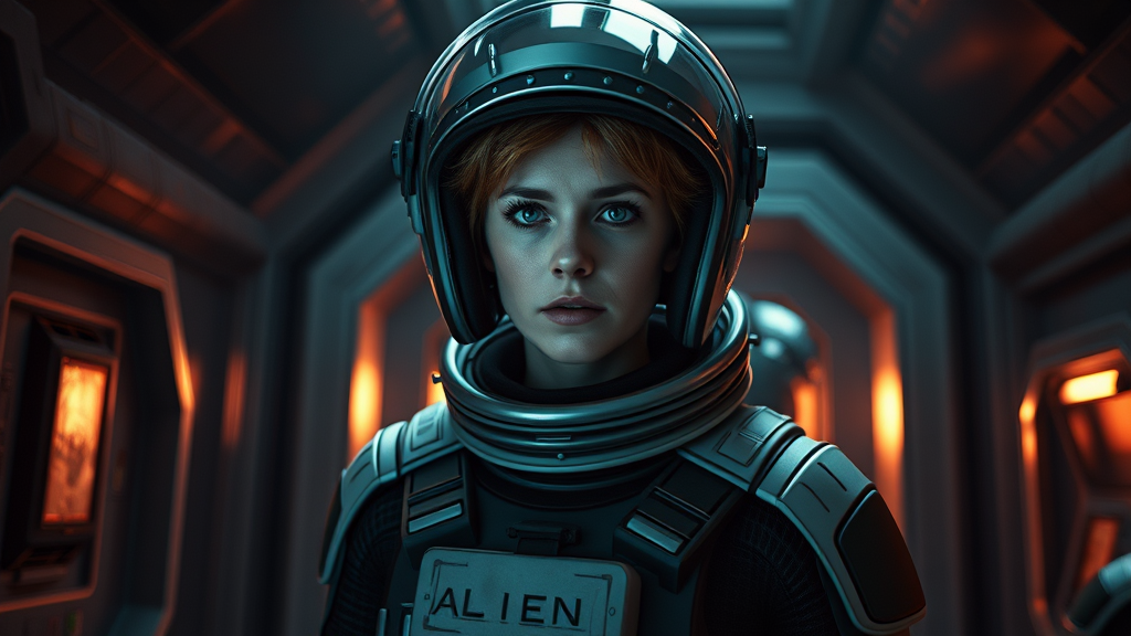 Epic cinematic 8k wallpaper depicting Ellen Ripley with a resolute expression from the Alien movie, clad in a detailed astronaut space suit with a helmet, her symmetrical features highlighted. She stands in a shadowy corner of the Nostromo's interior, merging sci-fi aesthetics with intricate design. The scene is captured with ray tracing technology, ensuring ultra-detailed and photo-realistic quality, akin to promotional art. The overcast reflection mapping adds depth, with cinematic movie-quality effects. Shot with a Canon 5D, the scene is rendered using Redshift, featuring RTX ray tracing lighting for stunning realism, presented in breathtaking 8K.