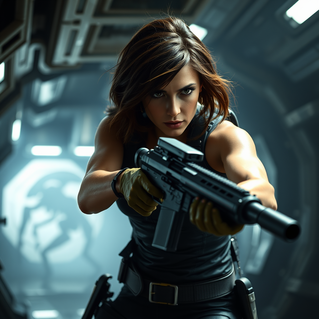 Epic cinematic 8k wallpaper featuring a reimagined Ellen Ripley from the Alien movie series, showcasing her in a dynamic action pose, wielding a futuristic weapon in an otherworldly setting. Her expression exudes determination and grit, with the ominous hint of a xenomorph lurking in the shadows. The scene is bathed in atmospheric lighting, highlighting the contrast between the industrial space environment and the eerie alien presence, while subtle creative modifications accentuate her iconic look with updated gear and technology.