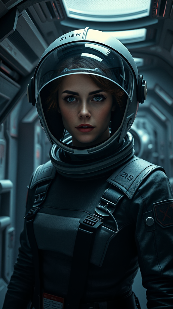 Epic cinematic 8k wallpaper featuring Ellen Ripley, with a determined expression, inspired by the Alien movie. She is clad in a meticulously detailed astronaut suit, helmet firmly in place. Her beautifully symmetrical face is highlighted as she stands poised in a shadowy corner of the Nostromo's iconic spaceship interiors. The scene is rich with sci-fi elements, enhanced by state-of-the-art Ray Tracing and ultra-detailed quality, delivering ultra-realistic, promotional art aesthetics. The atmosphere is deepened with overcast reflection mapping, achieving photorealistic cinematic visuals akin to movie-quality production. The VFX post-production is elevated with RTX ray tracing lighting, offering ultra-realistic depth, as though captured on a Canon 5D. Rendered with cutting-edge Redshift technology for unmatched detail in 8K resolution.