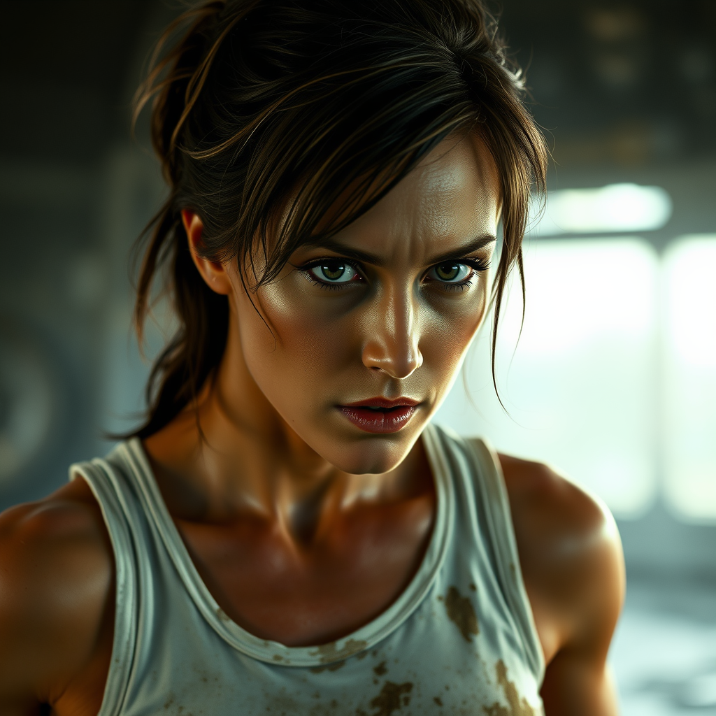 Epic cinematic 8k wallpaper featuring Ellen Ripley from the Alien movie, her face resolute and serious, dressed in a white battered and dirty tank top. The shot captures her in a dynamic action pose with a half-body composition, her forehead and cheeks glistening with sweat in a photorealistic style. The scene boasts cinematic movie quality with meticulous VFX post-production, including RTX ray tracing lighting. The ultra-realistic portrayal is hyper-detailed, utilizing HD, HDR, 4k, and 8k technology, shot on a Mitchell BNC camera using an octane render, maintaining the essence while adding a subtle futuristic touch with ambient neon reflections.