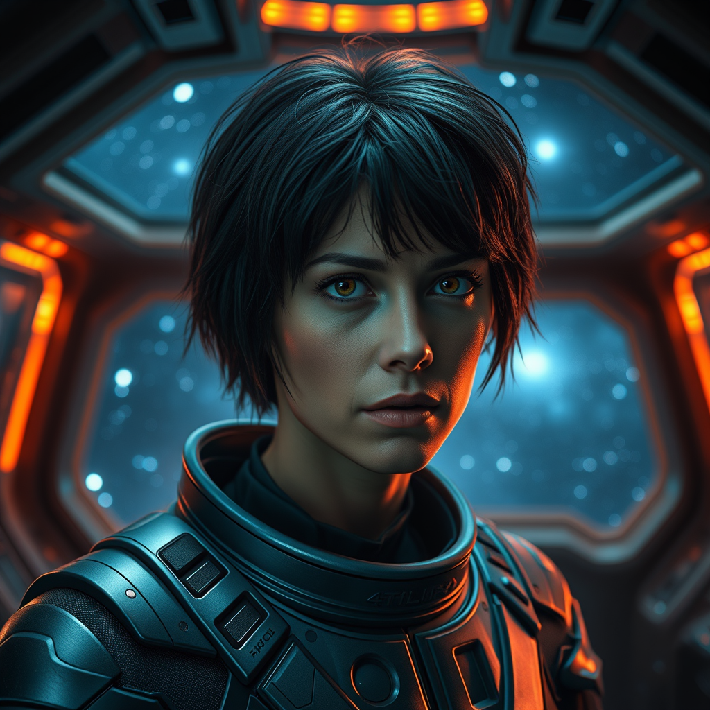 Epic cinematic 8k wallpaper featuring Ellen Ripley in a futuristic, high-tech spaceship interior, dramatic lighting casting shadows across her determined face, her iconic short hair slightly tousled, intense focus in her eyes, wearing a sleek, upgraded space suit with subtle futuristic designs, background showcasing a star-filled galaxy through large windows, rendered in octane for hyper-realistic textures and details, vibrant colors and sharp contrasts creating an immersive, lifelike scene.